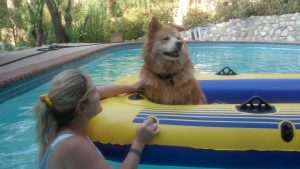 My Chikita (Chow-Akita) Haiku prefers just to sail around the pool in his boat! Pay attention and go your dog’s speed. Just like us, they learn by example, but also just like us…if they have a bad first experience, it’s so much harder to attempt a second!